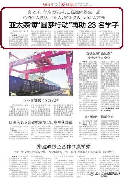 10月25日《黃海晨刊》整版報道 八屆學生、合計278人 完成學業(yè)并走上工作崗位 學生代表黃成金說 “圓夢行動”是自己的幸運和驕傲 ——亞太森博“圓夢行動”十一年助學路綜述 10月21日上午,亞太森博“圓夢行動”2021級新生開學典禮在日照職業(yè)技術(shù)學院舉行。 當天上午,齊魯工業(yè)大學、日照市委統(tǒng)戰(zhàn)部、日照市教育局、日照職業(yè)技術(shù)學院、日照經(jīng)濟技術(shù)開發(fā)區(qū)管委及亞太森博(山東)漿紙有限公司相關(guān)領(lǐng)導,23名來自日照、臨沂、濰坊等地的新生以及往屆“圓夢”學生代表齊聚一堂,共同憧憬美好未來。