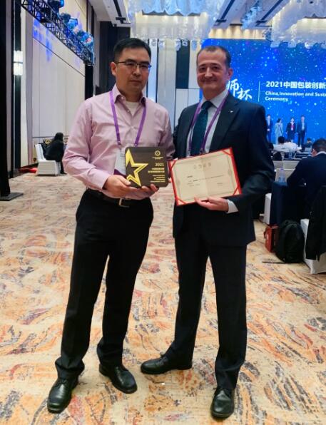 芬林紙板亞太區技術支持及銷售總監葉強在介紹碳足跡和生命周期評估 在同期舉行的2021美獅杯中國包裝創新及可持續發展大獎評選中,采用芬林紙板產品Mets?Board Pro FBB Bright 245 g/m2的新冠疫苗包裝榮獲論壇評選的“2021美獅杯中國包裝創新及可持續發展大獎”,該款疫苗產品由武漢生物制品研究所有限責任公司制造,包裝加工廠為西安環球印務。芬林紙板亞太區銷售副總裁卡梅隆(Carmelo Perez) 及芬林紙板中國區銷售經理鐘淵作為代表出席了頒獎儀式。