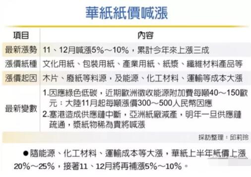 公開資料顯示,華紙是臺灣地區(qū)紙業(yè)巨頭,已發(fā)展為林漿紙一體化企業(yè),在大陸植林近三萬公頃、臺灣植林約一千公頃。今年前三季度,華紙累計(jì)合并營收163.95億元,年增20.95%,為近3年同期高點(diǎn)。 11月12日,華紙召開法說會,其纖維材料事業(yè)部總經(jīng)理陳瑞和強(qiáng)調(diào),2021年市場行情不變,以往看紙漿需求,由最初的木材紙漿原料成本決定紙價(jià),但現(xiàn)在隨能源、化工材料、運(yùn)輸成本等大漲,其他成本影響紙價(jià)的程度正急劇加大。 就造紙的主要成本來看,木片價(jià)格今年以來大漲50%-100%,目前每噸逾200美元,除了造紙業(yè)搶購,許多國家發(fā)電廠改燒木片發(fā)電,讓2021年木片價(jià)格上升。而島內(nèi)廢紙,則從每噸3000元升至目前的6000多元。 能源方面,在低碳綠色能源趨勢下,近期歐洲開始征收能源附加費(fèi),看紙種每噸收取40-150歐元,美國也在討論能源附加費(fèi)等議題,這些都可能持續(xù)抬高紙價(jià)。2021以來,能源成本大漲三倍,需要用到煤炭的化工原料跟著喊漲,11月一項(xiàng)造紙用化工原料就大漲兩成。 運(yùn)輸方面,隨著運(yùn)輸價(jià)格的逐步升高,運(yùn)輸成本占造紙成本的比重從個(gè)位數(shù)攀升到10個(gè)點(diǎn)。更可怕的是,塞港除了推升運(yùn)價(jià),也造成供應(yīng)鏈中斷,讓亞洲出口歐美的貨量減少,但全球需求并未減少,2022年一旦供應(yīng)鏈?zhǔn)柰ê棉D(zhuǎn),漿紙必然物以稀為貴,其價(jià)格勢必上漲。 華紙表示,如果料源、能源等成本沒有大幅下降,紙價(jià)非繼續(xù)上漲不可!為轉(zhuǎn)嫁成本壓力,華紙?jiān)诮衲晟习肽暌焉蠞q20-25%,接著11月、12月將再補(bǔ)漲5-10%。 備注:本文綜合整理于工商時(shí)報(bào)、中時(shí)電子報(bào),文中除有特別說明外,所有貨幣單位均為新臺幣。目前,1新臺幣≈0.23人民幣。