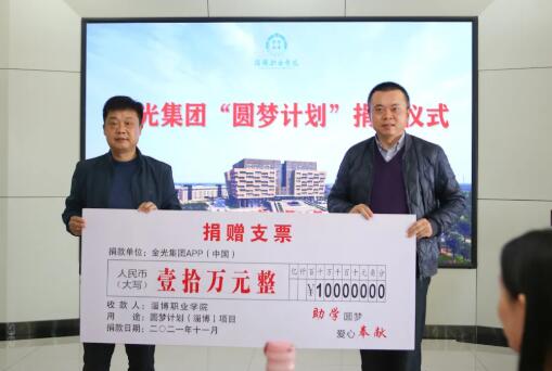 金光集團APP向淄博職業學院捐贈10萬元,用于“圓夢計劃”在淄項目運營 開學典禮現場還舉行了“圓夢計劃”運營管理費捐贈儀式,金光集團APP向淄博職業學院捐贈10萬元,用于“圓夢計劃”在淄項目運營。