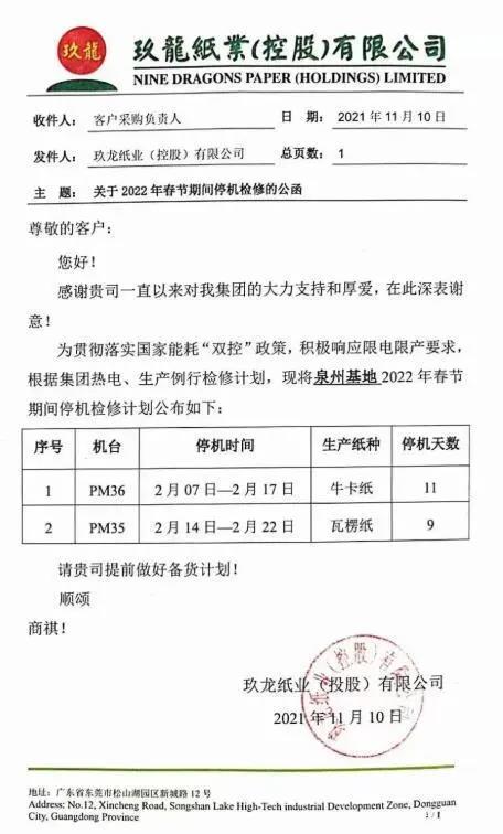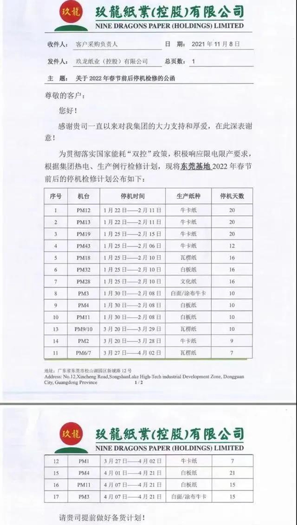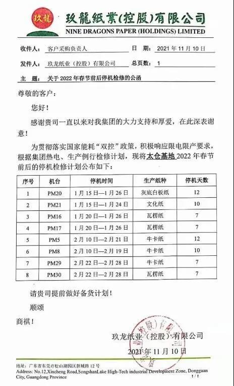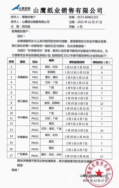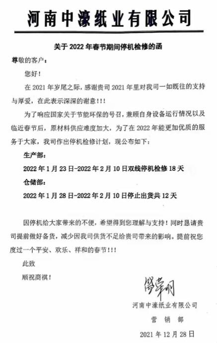 12月28日,河南中濠紙業(yè)也發(fā)布了關(guān)于2022年春節(jié)期間停機(jī)檢修的函。函稱,為了響應(yīng)國家關(guān)于節(jié)能環(huán)保的號召兼顧自身設(shè)備運(yùn)行情況以及臨近春節(jié)后,原材料供應(yīng)難度加大,為了在2022年能更加優(yōu)質(zhì)的服務(wù)于大家,公司作出如下停機(jī)檢修計(jì)劃: 生產(chǎn)部: 2022年1月23日-2022年2月10日雙線停機(jī)檢修18天 倉儲部: 2022年1月28日-2022年2月10日停止出貨共12天