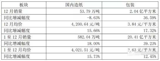 數據顯示,2021年12月份,山鷹國際國內造紙板塊銷量為53.79萬噸,同比下滑8.63%;均價4200.64元/噸,同比增長15.66%。2021年1-12月份,山鷹國內造紙板塊銷量582.04萬噸,同比增長18%;均價4021.51元/噸,同比增長15.73%。 而在包裝板塊,山鷹國際2021年12月份的銷量為2.04億平方米,同比增長36.59%;均價3.84元/平方米,同比增長17.32%。2021年1-12月份,山鷹包裝板塊銷量20.41億平方米,同比增長39.23%;均價3.63元/平方米,同比增長12.45%。 不過,以上為各主要板塊全口徑數據,未經合并抵消和審計。但整體來看,2021年,山鷹國際國內造紙、包裝板塊累計銷量持續增長,行業綜合競爭力逐步增強。