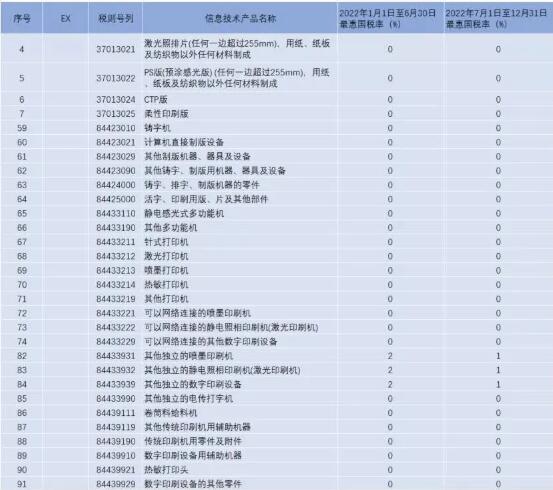 2021年12月,國(guó)務(wù)院關(guān)稅稅則委員會(huì)發(fā)布《中華人民共和國(guó)進(jìn)出口稅則(2022)》,宣布自2022年1月1日起,對(duì)部分進(jìn)口商品的最惠國(guó)稅率、協(xié)定稅率和暫定稅率進(jìn)行調(diào)整。 與2021年相比,2022年有關(guān)印刷設(shè)備器材的進(jìn)口關(guān)稅有所調(diào)整。為方便解讀,下面將分幾個(gè)部分具體分析。 一、《部分信息技術(shù)產(chǎn)品最惠國(guó)稅率表》中稅率的調(diào)整 《部分信息技術(shù)產(chǎn)品最惠國(guó)稅率表》中共包含了上百款產(chǎn)品。其中,與印刷設(shè)備器材相關(guān)的調(diào)整主要包括印刷版材、印前設(shè)備、數(shù)字印刷設(shè)備,以及印刷零配件和輔助設(shè)備等產(chǎn)品,并且這些產(chǎn)品的關(guān)稅再次調(diào)整(見(jiàn)下表)。