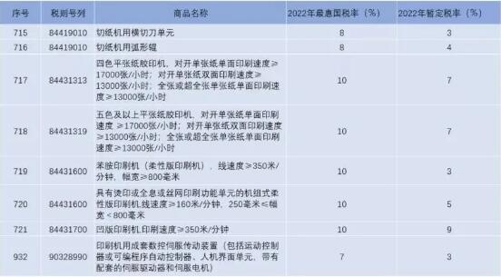 表1 《部分信息技術(shù)產(chǎn)品最惠國(guó)稅率表》與印刷設(shè)備器材相關(guān)的調(diào)整 1、印刷版材、印前設(shè)備類產(chǎn)品最惠國(guó)關(guān)稅繼續(xù)為零 在2019年7月1日之后,“激光照排片(任何一邊超過(guò)255mm),用紙、紙板及紡織物以外任何材料制成”“PS版(預(yù)涂感光版)(任何一邊超過(guò)255mm),用紙、紙板及紡織物以外任何材料制成”“CTP版”“柔性印刷版”等印刷版材類產(chǎn)品實(shí)施的最惠國(guó)稅率已經(jīng)為零;“鑄字機(jī)”“計(jì)算機(jī)直接制版設(shè)備”“其他制版機(jī)器、器具及設(shè)備”“其他鑄字、制版用機(jī)器、器具及設(shè)備”等印前設(shè)備類產(chǎn)品實(shí)施的最惠國(guó)稅率也已經(jīng)為零。2022年全年,以上產(chǎn)品實(shí)施的最惠國(guó)稅率依然為零。 2、數(shù)字印刷設(shè)備類產(chǎn)品關(guān)稅普遍下降超過(guò)1個(gè)百分點(diǎn),部分產(chǎn)品維持零關(guān)稅 在2021年7月1日以后,“可以網(wǎng)絡(luò)連接的噴墨印刷機(jī)”“可以網(wǎng)絡(luò)連接的靜電照相印刷機(jī)(激光印刷機(jī))”“可以網(wǎng)絡(luò)連接的其他數(shù)字印刷設(shè)備”等數(shù)字印刷設(shè)備類產(chǎn)品實(shí)施的最惠國(guó)稅率均已降為零。2022年全年,以上產(chǎn)品實(shí)施的最惠國(guó)稅率依然為零。 在2022年7月1日之前,“其他獨(dú)立的噴墨印刷機(jī)”“其他獨(dú)立的靜電照相印刷機(jī)(激光印刷機(jī))”“其他獨(dú)立的數(shù)字印刷設(shè)備”等數(shù)字印刷設(shè)備類產(chǎn)品實(shí)施的最惠國(guó)稅率均為2.0%,但在2022年7月1日以后,這些產(chǎn)品的關(guān)稅將再下降1個(gè)百分點(diǎn),到1.0%。 3、印刷設(shè)備零配件及輔助設(shè)備關(guān)稅維持零關(guān)稅 除印刷版材類產(chǎn)品、印前設(shè)備類產(chǎn)品實(shí)施的最惠國(guó)稅率為零,數(shù)字印刷類產(chǎn)品的實(shí)施的最惠國(guó)稅率持續(xù)下降外,一些傳統(tǒng)和數(shù)字印刷設(shè)備的零配件、輔助設(shè)備等,繼續(xù)維持零關(guān)稅。 綜上,在《部分信息技術(shù)產(chǎn)品最惠國(guó)稅率表》中,除“其他獨(dú)立的噴墨印刷機(jī)”“其他獨(dú)立的靜電照相印刷機(jī)(激光印刷機(jī))”“其他獨(dú)立的數(shù)字印刷設(shè)備”等數(shù)字印刷設(shè)備類產(chǎn)品外,其余與印刷設(shè)備與器材相關(guān)的產(chǎn)品在2022年全年維持零關(guān)稅。 二、《進(jìn)口商品暫定稅率表》中印刷相關(guān)產(chǎn)品稅率的調(diào)整 根據(jù)最新發(fā)布的《進(jìn)口商品暫定稅率表》顯示,與印刷設(shè)備及器材相關(guān)的部分產(chǎn)品在2022年1月1日以后,最惠國(guó)稅率沒(méi)有調(diào)整,保持穩(wěn)定(見(jiàn)下表)。