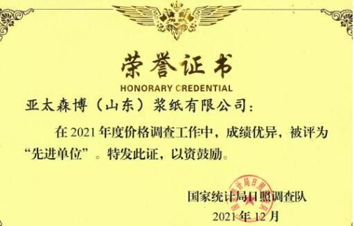 近日,國家統計局日照調查隊授予亞太森博“先進單位”稱號,以表彰公司在2021年度的價格調查工作。