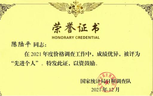 2021年,在財務工作任務重、調查時間特別緊的情況下,公司克服了各種困難,積極配合國家統計局日照調查隊的價格調查工作,及時準確地完成每月數據上報工作,圓滿完成了國家統計局下達的各項調查任務,成績卓越,充分發揮了先進典型的示范作用。經國家統計局日照調查隊考評,決定授予公司為“2021年度價格調查工作先進單位”,同時授予公司財務部員工陳陸平為“2021年度價格調查工作先進個人”。