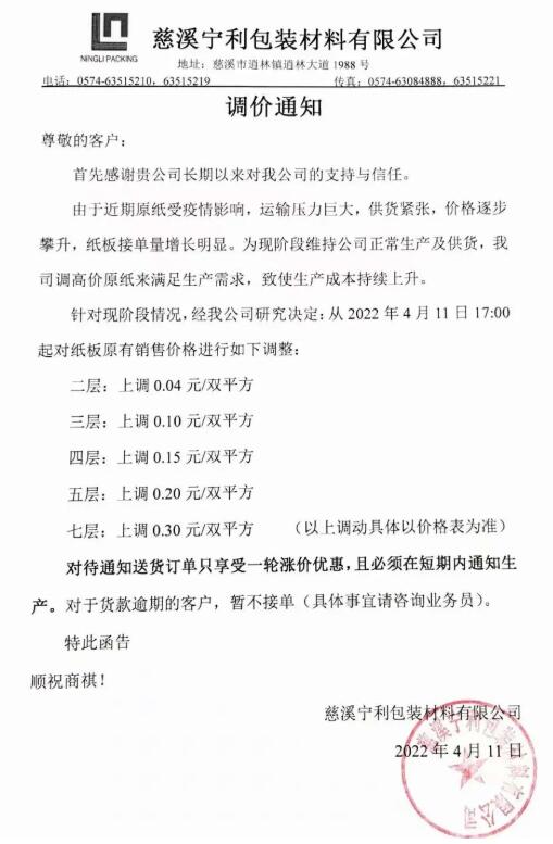 慈溪寧利包裝:4月11日17點(diǎn)起,對(duì)紙板價(jià)格進(jìn)行調(diào)整,二層、三層、四層、五層、七層紙板價(jià)格按原基礎(chǔ)上調(diào)0.04元/雙平方、0.10元/雙平方、0.15元/雙平方、0.20元/雙平方、0.30元/雙平方;