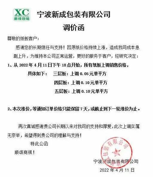 受到疫情的影響,從3月開(kāi)始,多地快遞物流出現(xiàn)了階段性延緩甚至中斷。現(xiàn)在對(duì)于紙箱行業(yè)人士來(lái)說(shuō),除了擔(dān)心水漲船高的成本,還要憂愁物流能不能送到的難題。有多家紙箱廠反映,平時(shí)2-4天就能到的材料,現(xiàn)在至少要5-7天,極端點(diǎn)的甚至要10幾天。 在交貨壓力下,從3月底開(kāi)始上海及周邊部分紙板、紙箱訂單以高出地區(qū)平均水平的價(jià)格外流,并造成紙板價(jià)格異常上漲。以臨近上海的蘇州某紙板廠為例,其紙板價(jià)格自疫情來(lái)已經(jīng)漲了將近20%。 而隨著受物流受阻及停工影響的地區(qū)增多,從上周起,該工廠也被迫停工,訂單再度往更遠(yuǎn)的周邊地區(qū)流出,帶來(lái)的交貨周期延長(zhǎng)和價(jià)格上漲,讓本就缺料的下游雪上加霜。此外,由于疫情因素,原紙供應(yīng)減少,導(dǎo)致原紙漲價(jià),也在推動(dòng)紙板價(jià)格上漲。下圖為已發(fā)布的漲價(jià)函: 寧波豐宇包裝: