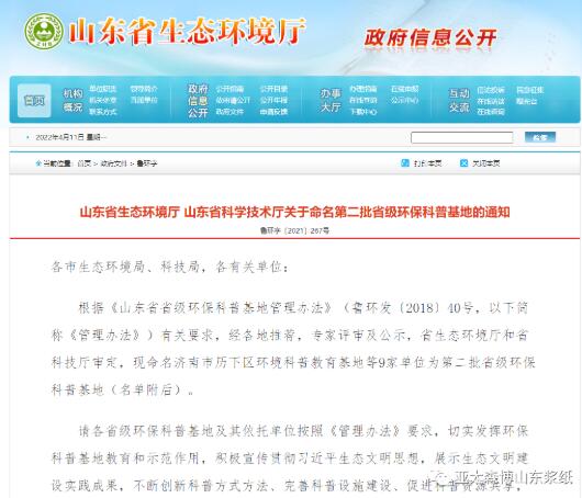 根據(jù)《山東省省級環(huán)保科普基地管理辦法》要求,近日,省生態(tài)環(huán)境廳、省科學技術(shù)廳聯(lián)合組織開展了第二批省級環(huán)?破栈氐纳陥蠛驮u審工作,經(jīng)專家審核、評議,全省共有9家單位獲此殊榮,位于日照經(jīng)開區(qū)的亞太森博(山東)漿紙有限公司名列其中。