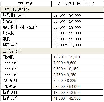上游原材料方面,丙烯酸均價下調約9.5%,至1.3萬~1.5萬元/t,40D氨綸均價下調約2%,至5.3萬~5.4萬元/t,其他材料價格都有不同程度的上漲,幅度在2%~4%之間。熱風非織造布價格仍在1.95萬~3萬元/t的區間,與2月基本持平;復合芯體價格約為1.5萬~2.0萬元/t,價格區間變化不大,有些產品價格上調2%左右,主要是因為各種原材料價格上漲所致;高吸收性樹脂(SAP)價格約為1.3萬~1.8萬元/t,價格區間基本保持不變,但由于原材料價格上漲及疫情影響,企業有不同程度的調價;熱熔膠價格約為1.3萬~2.2萬元/t,與2月基本持平,個別企業因原材料價格上漲調整價格但仍在此區間;薄膜價格約為1.2萬~2.2萬元/t,與2月持平;塑料母粒價格約為1.2萬~1.7萬元/t,比2月上調10%左右,主要是由于國際原油價格上漲及海運費上漲等不利因素造成的。