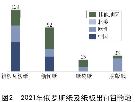 在紙和紙板方面,俄羅斯出口集中在箱板瓦楞紙(129萬t)、新聞紙(92萬t)、膠版紙(33萬t)以及紙袋紙(25萬t)上,出口目的地如圖2所示。中國是俄羅斯箱板瓦楞紙和新聞紙出口的主要目的地,也有一定量出口到歐洲市場。假如制裁加劇,紙和紙板的部分出口會被暫時終止,考慮到物流阻礙,對中國的出口也將承壓。歐洲部分國家由于供應中斷,已經出現了印刷紙的短缺現象。