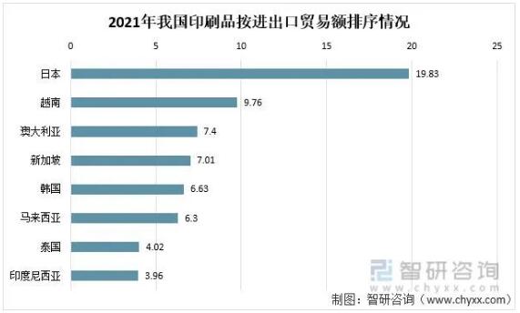 按進出口貿易額排序,國內印刷產業與RCEP成員國進出口貿易往來的主要國家是,日本(19.83億美元)、越南(9.76億美元)、澳大利亞(7.40億美元)、新加坡(7.01億美元)、韓國(6.63億美元)、馬來西亞(6.30億美元)、泰國(4.02億美元)、印度尼西亞(3.96億美元)。上述8國相關進出口占中國與RCEP其他成員國相關進出口貿易總金額的90%。 2021年我國印刷品按進出口貿易額排序情況