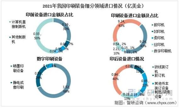 資料來源:中國印刷及設備器材工業協會、智研咨詢整理 2021年國內印刷裝備進口24.73億美元。其中,印前設備進口0.65億美元、印刷設備進口21.75億美元、數字印刷設備2.22億美元、印后設備進口2.33億美元。 2021年我國印刷裝備細分領域進口情況(億美金)