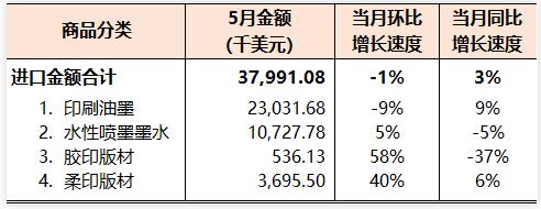 印刷器材 2022年5月國內(nèi)印刷器材進口3799.11萬美元(參見表6),環(huán)比下降1%、同比增長3%。其中,印刷油墨進口2303.17萬美元(環(huán)比下降9%、同比增長9%)、水性噴墨墨水進口1072.78萬美元(環(huán)比增長5%、同比下降5%)、膠印版材進口53.61萬美元(環(huán)比增長58%、同比下降37%)、柔印版材369.55萬美元(環(huán)比增長40%、同比增長6%)。 表6 2022年5月國內(nèi)印刷器材進口統(tǒng)計