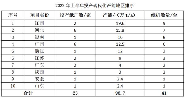 據(jù)生活用紙委員會調(diào)研,2022年1—6月,行業(yè)新投產(chǎn)現(xiàn)代化產(chǎn)能約96.7萬t/a,共41臺紙機,包括國產(chǎn)紙機37臺、進口紙機4臺。其中,第一季度投產(chǎn)62.4萬t,第二季度投產(chǎn)34.3萬t。