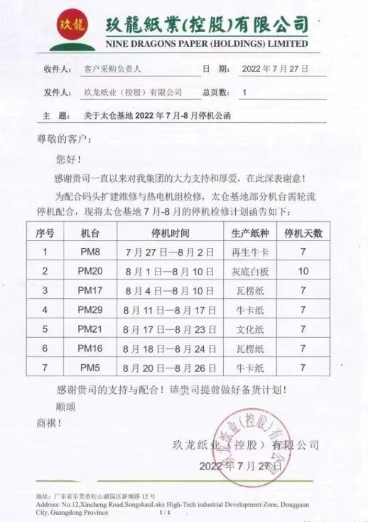 繼東莞玖龍宣布停機檢修之后,7月27日-7月28日,玖龍紙業旗下太倉、泉州、重慶、沈陽、河北及天津基地亦相繼發布輪流停機計劃。 在新宣布停機檢修的六大基地中,除沈陽玖龍僅在7月27日-7月29日對一條紙機停機3天外,其余生產基地均涉及多臺紙機,且單臺紙機停機時長至少在5天以上,有的甚至長達21天。 太倉玖龍 太倉玖龍最早停機的紙機為再生牛卡紙機PM8,停機時間為7月27日-8月2日。除PM8外,停機時長為7天的紙機還包括瓦楞紙機PM17、PM16,牛卡紙機PM29、PM5,以及文化紙機PM21。灰底白板紙機PM20停機時間最久,為10天。 太倉玖龍紙業是玖龍紙業目前旗下第二大生產基地,共有8臺紙機,總設計年產能超300萬噸。本次停機計劃中,僅有瓦楞紙機PM30未被列入其中。