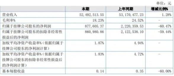 8月17日,興港包裝(代碼:430586.NQ)發(fā)布2022年半年報業(yè)績報告。2022年1月1日 -2022年6月30日,公司實現(xiàn)營業(yè)收入5249.25萬元,同比下降1.28%,凈利潤87.76萬元,同比下降60.47%,基本每股收益為0.1400元。
