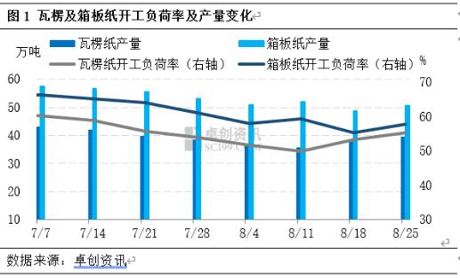 [導語] 進入8月份瓦楞及箱板紙市場供需兩端均呈現弱勢運行,規模紙廠停機消息頻發,上游主動從生產端減量,來緩解供應端壓力;而傳統中秋節訂單并沒有明顯起色,需求端整體仍顯疲軟。接下來從供需角度出發來分析一下市場走勢: 紙廠主動停機檢修,緩解供應端壓力 進入下半年以來,瓦楞及箱板紙市場面臨較大的供應壓力,紙價承壓明顯下行。因此上游紙廠主動停機檢修,來緩解供應端壓力。截至8月25日,瓦楞紙開工負荷率為55.22%,較6月底開工負荷下滑5.44個百分點,產量較6月底減少8.65%;箱板紙開工負荷率為57.68%,較6月底開工負荷下滑7.94個百分點,產量較6月底減少10.39%。紙廠開工負荷下滑后,市場現貨供應量減少,供應端壓力稍有緩解,但多數紙廠前期庫存處于高位,因此整體供應壓力仍存,對紙價仍形成一定利空影響。