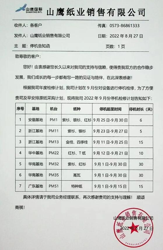 此外,早前山鷹紙業(yè)也發(fā)布了9月停機(jī)函,宣布五大基地7臺(tái)紙機(jī)于9月1日-30日輪停5-30天!