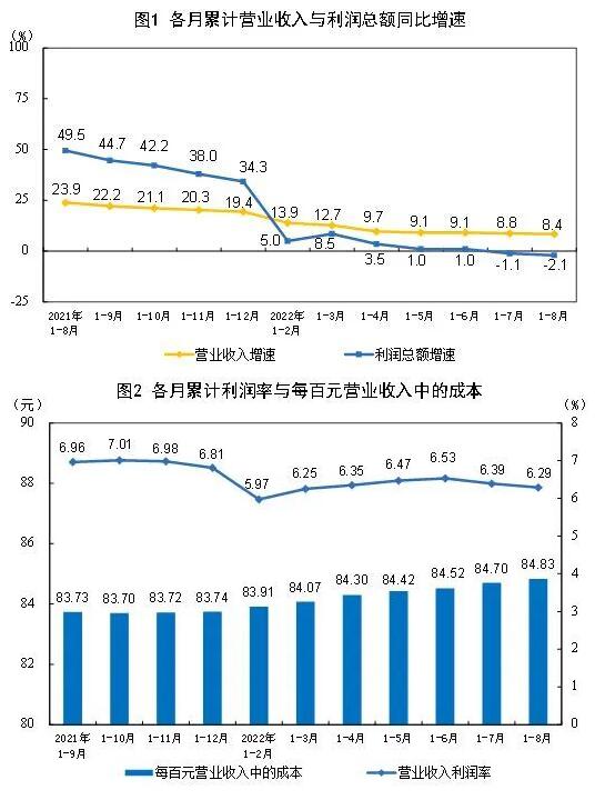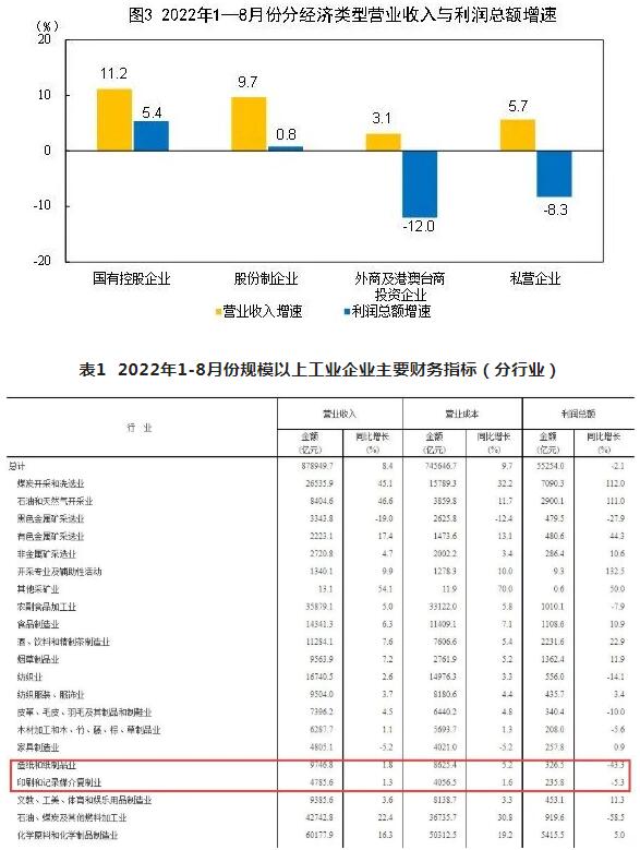 近日,國(guó)家統(tǒng)計(jì)局網(wǎng)站發(fā)布2022年1-8月份全國(guó)規(guī)模以上工業(yè)企業(yè)利潤(rùn)。同期,國(guó)家統(tǒng)計(jì)局工業(yè)司高級(jí)統(tǒng)計(jì)師朱虹就數(shù)據(jù)情況進(jìn)行了解讀。 數(shù)據(jù)顯示,1—8月份,全國(guó)規(guī)模以上工業(yè)企業(yè)實(shí)現(xiàn)利潤(rùn)總額5.53萬(wàn)億元,同比下降2.1%。 1—8月份,在41個(gè)工業(yè)大類行業(yè)中,16個(gè)行業(yè)利潤(rùn)總額同比增長(zhǎng),25個(gè)行業(yè)下降。 值得關(guān)注的是,造紙和紙制品業(yè)實(shí)現(xiàn)營(yíng)業(yè)收入9746.8億元,同比增長(zhǎng)1.8%;利潤(rùn)總額326.5億元,同比下降43.3%。印刷和記錄媒介復(fù)制業(yè)實(shí)現(xiàn)營(yíng)業(yè)收入4785.6億元,同比增長(zhǎng)1.3%;利潤(rùn)總額235.8億元,同比下降5.3%。 1—8月份,規(guī)模以上工業(yè)企業(yè)實(shí)現(xiàn)營(yíng)業(yè)收入87.89萬(wàn)億元,同比增長(zhǎng)8.4%;發(fā)生營(yíng)業(yè)成本74.56萬(wàn)億元,增長(zhǎng)9.7%;營(yíng)業(yè)收入利潤(rùn)率為6.29%,同比下降0.67個(gè)百分點(diǎn)。 8月末,規(guī)模以上工業(yè)企業(yè)資產(chǎn)總計(jì)150.99萬(wàn)億元,同比增長(zhǎng)9.6%;負(fù)債合計(jì)85.76萬(wàn)億元,增長(zhǎng)10.0%;所有者權(quán)益合計(jì)65.23萬(wàn)億元,增長(zhǎng)9.2%;資產(chǎn)負(fù)債率為56.8%,同比提高0.2個(gè)百分點(diǎn)。 1—8月份,規(guī)模以上工業(yè)企業(yè)每百元營(yíng)業(yè)收入中的成本為84.83元,同比增加1.04元;每百元營(yíng)業(yè)收入中的費(fèi)用為7.91元,同比減少0.51元。 8月末,規(guī)模以上工業(yè)企業(yè)每百元資產(chǎn)實(shí)現(xiàn)的營(yíng)業(yè)收入為89.9元,同比減少1.4元;人均營(yíng)業(yè)收入為176.2萬(wàn)元,同比增加15.3萬(wàn)元;產(chǎn)成品存貨周轉(zhuǎn)天數(shù)為18.3天,同比增加0.8天;應(yīng)收賬款平均回收期為54.4天,同比增加2.9天。