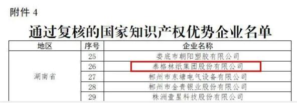 近日,國家知識產權局發布“關于確定2022年第一批及通過復核的國家知識產權示范企業和優勢企業通知”,泰格林紙順利通過國家知識產權優勢企業復核。