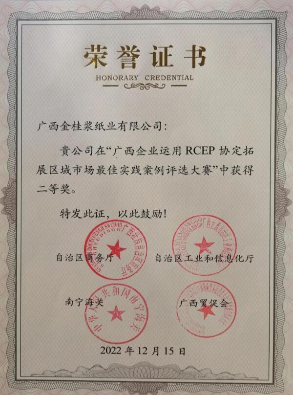 2022年12月30日上午,廣西高質量實施RCEP一周年成果發布會在南寧舉行,會議為運用RCEP協定拓展區域市場最佳實踐案例企業頒發了榮譽證書,APP(中國)旗下廣西金桂漿紙憑借過硬實力在案例大賽中獲得佳績。這是金桂在2022年獲得“欽州首份RCEP原產地證書”、“欽州首家海關經核準出口商”、“廣西RCEP推廣實施試點企業”之后,再次榮獲的“RCEP”相關榮譽。