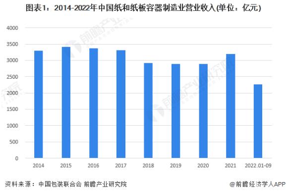 隨著我國紙制品包裝行業(yè)產(chǎn)業(yè)結(jié)構(gòu)調(diào)整的深入,2015年之后,我國紙制品包裝行業(yè)規(guī)模呈現(xiàn)下降趨勢。2021年,我國紙和紙板容器制造業(yè)完成累計收入3192.03億元,同比增長13.56%,結(jié)束了連續(xù)幾年下降的勢頭。2022年前三季度,中國紙和紙板容器制造業(yè)營業(yè)收入達(dá)到2271.27億元,同比略微減少1.27%。