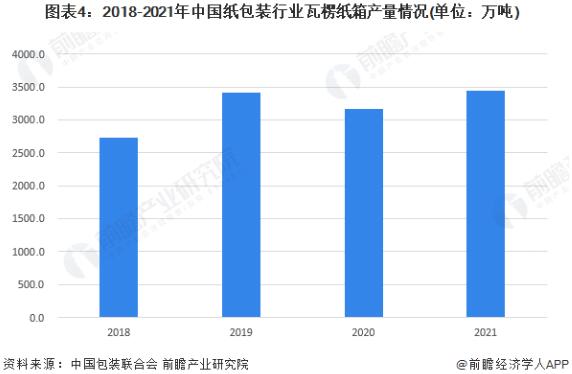 瓦楞紙箱是最主要的包裝紙制品,根據(jù)中國包裝聯(lián)合會數(shù)據(jù),2018-2021年中國紙包裝行業(yè)瓦楞紙箱產(chǎn)量呈波動增長態(tài)勢,2021年產(chǎn)量規(guī)模達(dá)到3444.20萬噸,同比增長8.62%。