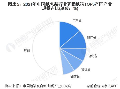 中國瓦楞紙箱產(chǎn)量前五大省市依次是廣東省、浙江省、湖北省、福建省、湖南省,前五大省市產(chǎn)量規(guī)模合計占比47.71%。其中,廣東省2021年產(chǎn)量達(dá)到1057.93萬噸,占據(jù)全國13.67%,產(chǎn)量規(guī)模位居全國第一。