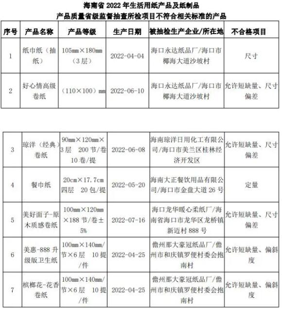 不合格產(chǎn)品涉及抽樣自海口永達紙品廠的1批次紙巾紙(抽紙)、1批次好心情高級卷紙;抽樣自海南瓊洋日用化工有限公司的1批次瓊洋(經(jīng)典)卷紙;抽樣自海南大正餐飲用品有限公司的1批次餐巾紙等。不合格項目為:衛(wèi)生紙的“尺寸偏差”、“偏斜度”、“允許短缺量”和紙巾紙的“尺寸”、“定量”。