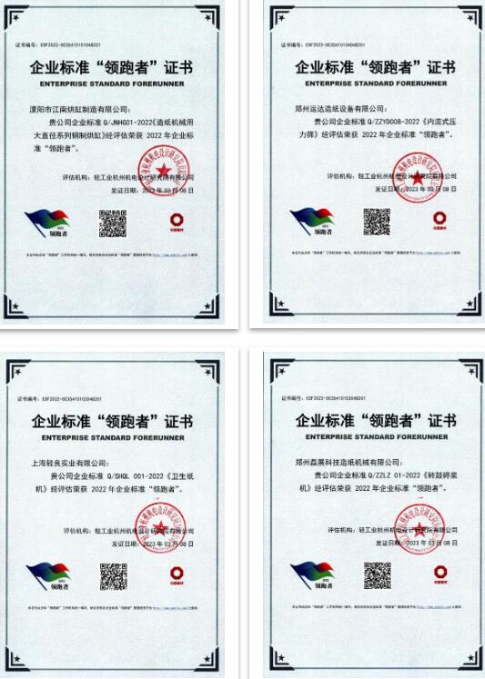 溧陽市江南烘缸制造有限公司、鄭州運達造紙設備有限公司、上海輕良實業有限公司、鄭州磊展科技造紙機械有限公司等4家企業在公示期無異議后分別榮獲鋼制烘缸、壓力篩、衛生紙機、鼓式碎漿機2022年企業標準“領跑者”。