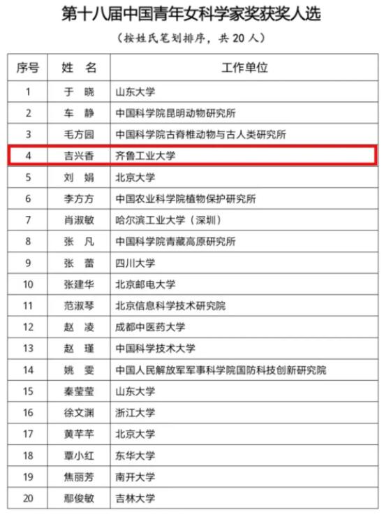 4月22日,第十八屆中國青年女科學家獎頒獎典禮在北京舉行,共有20位女科學家獲獎。齊魯工業大學(山東省科學院)輕工學部主任、生物基材料與綠色造紙國家重點實驗室常務副主任吉興香,因在高性能木材化學漿綠色制備與高值利用關鍵技術及產業化等方面的突出貢獻獲得此項殊榮,也是校(院)首位獲得此項獎勵的女科學家。 中國青年女科學家獎由中國科協與全國婦聯、中國聯合國教科文組織全國委員會、歐萊雅(中國)有限公司于2004年設立,是面向女性科技工作者的全國性獎項,旨在表彰獎勵在科學領域取得重大科技成果的女性青年科學家,以榜樣的力量激勵青年女性投身科學。