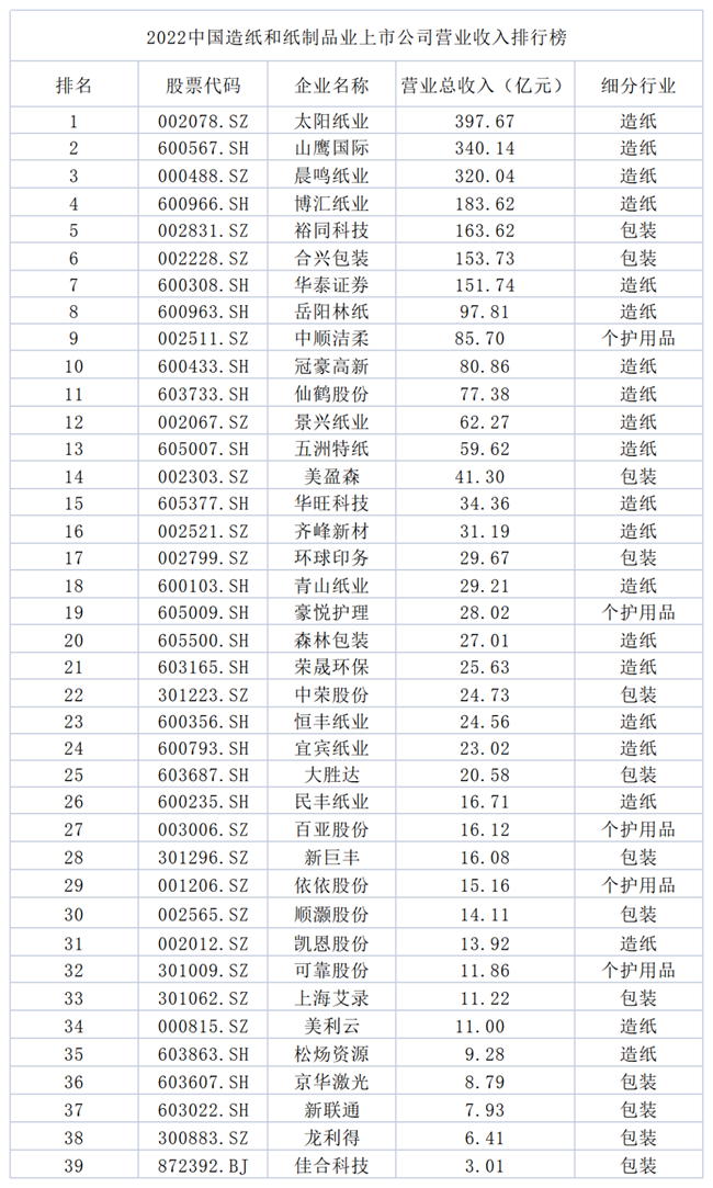 2022年中國造紙和紙制品業上市公司營業收入排行榜