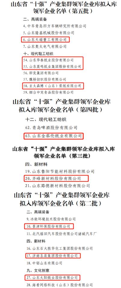 近期,山東省發改委會同有關部門組織開展了2023年度山東省“十強”產業“雁陣形”集群和集群領軍企業的申報評審工作。嚴格按照各市申報、專班初審、專家評審、信用查詢、評價審核等程序,研究確定了2023年度重點培育的37個“十強”產業“雁陣形”集群和59家“十強”產業集群領軍企業,并于6月9日對入選企業名單進行了公示。其中,山東華泰紙業股份有限公司、山東晨鳴紙業集團股份有限公司、亞太森博(山東)漿紙有限公司和山東天瑞重工有限公司成功入圍山東省“十強”產業集群領軍企業名單(第五批)。此前,景津環保股份有限公司、濟南圣泉集團股份有限公司、山東太陽紙業股份有限公司,齊峰新材料股份有限公司,山東金蔡倫紙業有限公司分別于2020、2021、2022年入圍第二、三、四批山東省“十強”產業集群領軍企業名單。