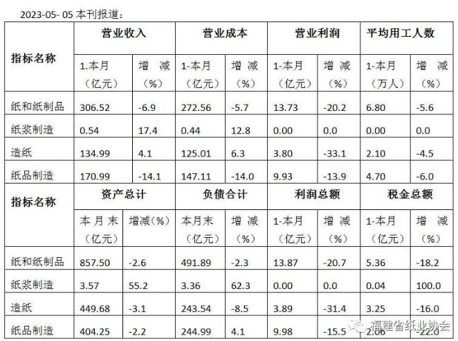 福建省2023年1-3月份造紙及紙制品工業經濟效益概況