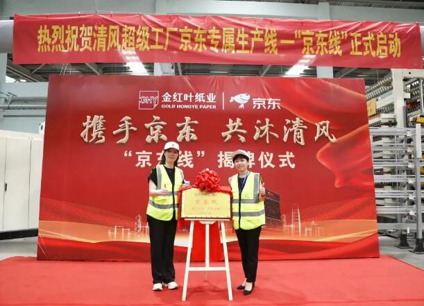 簽約儀式后,京東超市高管一行還參觀了生產“清風”的金光如東生活用紙基地,近距離感受了基地現代化、智能化、數字化的作業模式,也更直觀地了解到每一張“清風”紙是如何誕生的。在生產線現場,金紅葉紙業CMO王櫻與京東集團副總裁、京東超市潔護母嬰業務部總經理牛英華共同為“清風”品牌和京東超市聯合打造的京東超市專屬生產線“京東線”揭牌。