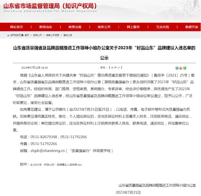 7月21日 山東省質量強省及品牌戰略 推進工作領導小組辦公室 公示2023年“好品山東”品牌建議名單 亞太森博入選制造企業品牌建議名單