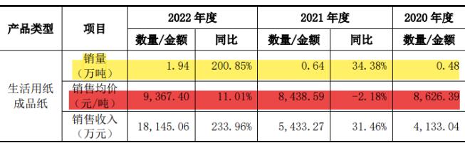 近年來,鳳生股份大力拓展了生活用紙成品紙的銷售渠道,通過提高生活用紙成品紙的市場(chǎng)占有率以提升其行業(yè)影響力和綜合競(jìng)爭(zhēng)力。 2020年-2022年,鳳生股份生活用紙成品紙的銷量分別為4800噸、6400噸、1.94萬噸,銷售均價(jià)分別為8,626.39萬元、8,438.59萬元、9,367.40萬元。可以看到,2022年,鳳生股份生活用紙成品紙的銷量增長(zhǎng)了2倍有余,銷售均價(jià)也同比增長(zhǎng)了11%。