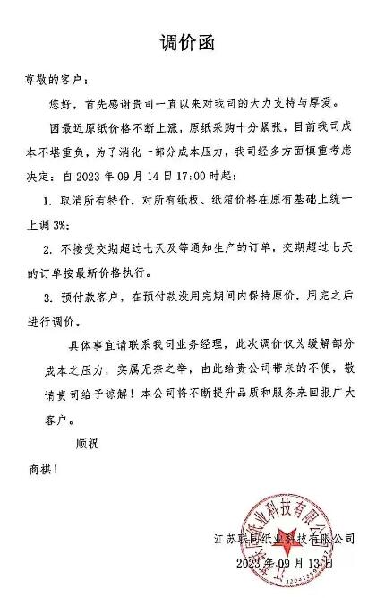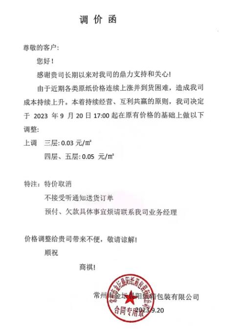 紙板廠最新漲價信息: