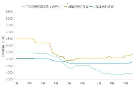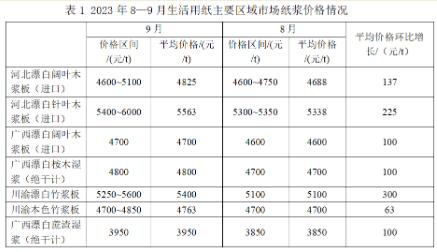 圖2 2023年1—9月川渝竹漿和廣西漂白蔗渣漿平均價格變化趨勢 從各類紙漿價格變化曲線,以及國內市場目前紙漿的供應情況來分析,木漿和非木漿價格變化存在一定的相關性。非木漿價格一定程度上受到木漿價格變化的影響,當木漿價格上漲時,非木漿也呈現不同程度的上漲,但值得注意的是,本色竹漿由于需求減少,2023年以來至今價格一直相對較為穩定。 2023年9月,河北漂白闊葉木漿板(進口)平均價格4825元/t、河北漂白針葉木漿板(進口)平均價格5563元/t、廣西漂白闊葉木漿板(進口)平均價格4700元/t、廣西本地漂白桉木濕漿(絕干計)平均價格約4800元/t,較2023年8月均有所上漲。 非木漿中,川渝漂白竹漿平均價格約5400元/t,較2023年8月(5100元/t)上漲300元/t;本色竹漿平均價格約4763元/t,較2023年8月(4700元/t)略有上漲。廣西漂白蔗渣濕漿(絕干計)平均價格約3950元/t,較2023年8月(3850元/t)上漲100元/t。具體變化情況見表1。