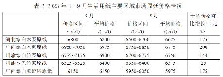 圖3 2023年1—9月生活用紙原紙出廠平均價格變化趨勢 原紙價格9月情況,河北漂白木漿原紙平均價格約6800元/t,較2023年8月上漲約175元/t。廣西漂白木漿原紙平均價格約6975元/t,較2023年8月均上漲約200元/t。 川渝漂白竹漿原紙平均價格約6900元/t,較2023年8月(6756元/t)上漲144元/t;本色竹漿原紙平均價格約6400元/t,較2023年8月(6375元/t)略有上漲。 廣西漂白蔗渣漿原紙平均價格約6150元/t,較2023年8月(5975元/t)上漲175元/t。具體情況見表2。 受漿價上行影響,預計原紙價格短期內仍將呈上漲趨勢。