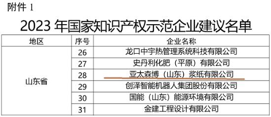 近日,國(guó)家知識(shí)產(chǎn)權(quán)局公布了“2023年國(guó)家知識(shí)產(chǎn)權(quán)優(yōu)勢(shì)和示范企業(yè)”評(píng)定結(jié)果,亞太森博(山東)漿紙有限公司(下文簡(jiǎn)稱:亞太森博)成功入選“國(guó)家知識(shí)產(chǎn)權(quán)示范企業(yè)”。