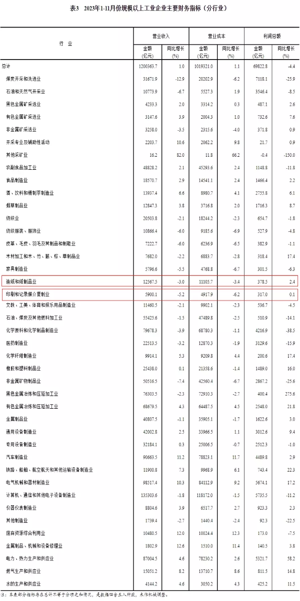 在41個工業(yè)大類行業(yè)中,造紙和紙制品業(yè)在1-11月份實現(xiàn)利潤總額378.5億元,同比增長2.4%;印刷和記錄媒介復(fù)制業(yè)在1-11月份實現(xiàn)利潤總額317.0億元,同比增長0.1%。 在營業(yè)收入方面,1-11月份,規(guī)模以上工業(yè)企業(yè)實現(xiàn)營業(yè)收入120.04萬億元,同比增長1.0%。其中,造紙和紙制品業(yè)實現(xiàn)營業(yè)收入12567.5億元,同比下降3.0%;印刷和記錄媒介復(fù)制業(yè)實現(xiàn)營業(yè)收入5900.1億元,同比下降5.2%。