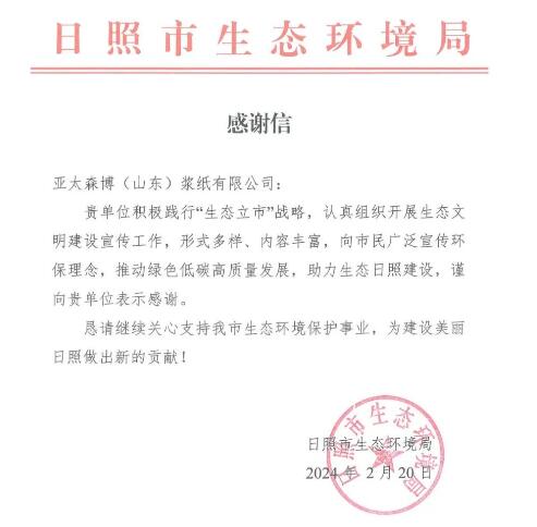 2月20日,日照市生態(tài)環(huán)境局向公司發(fā)來感謝信,對(duì)公司積極踐行“生態(tài)立市”戰(zhàn)略、認(rèn)真組織生態(tài)文明建設(shè)宣傳工作、向市民廣泛宣傳環(huán)保理念、推動(dòng)城市綠色低碳高質(zhì)量發(fā)展、助力生態(tài)日照建設(shè)等方面的貢獻(xiàn)表示感謝。