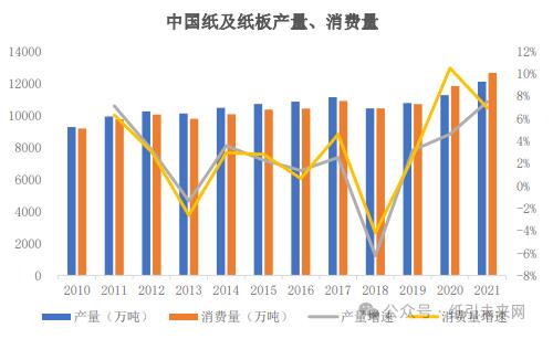 隨著我國經濟總量的持續增長,我國紙及紙板的生產量和消費量也穩步增長。我國紙及紙板生產量由2010年的9,270萬噸增長至2021年的12,105萬噸,年均復合增長率為2.46%,消費量由2010年的9,173萬噸增長至12,648萬噸,年均復合增長率為2.96%。自2010年至今,除2013年和2018年以外,其他年度我國紙及紙板的生產量和消費量均呈上升趨勢。特別是2020年和2021年,我國紙及紙板消費量同比增速分別為10.49%和6.94%,增長速度較快。2010-2021年,我國紙及紙板產量和消費量變動情況如下: