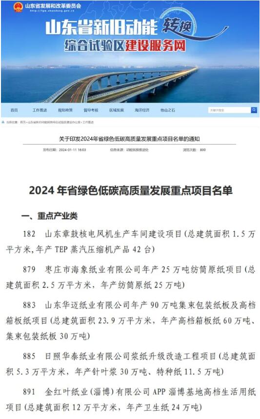2024年1月11日,山東省發展和改革委員會發布《關于印發2024年省綠色低碳高質量發展重點項目名單的通知》(魯發改動能辦〔2024〕7號),確定2024年度山東省綠色低碳高質量發展重點項目1400項。其中棗莊市海象紙業有限公司年產25萬噸紡筒原紙項目、山東華邁紙業有限公司年產90萬噸集束包裝紙板及高檔箱板紙項目、日照華泰紙業有限公司漿紙升級改造工程項目、金紅葉紙業(淄博)有限公司APP淄博基地高檔生活用紙項目和山東章鼓核電風機生產車間建設項目入選。