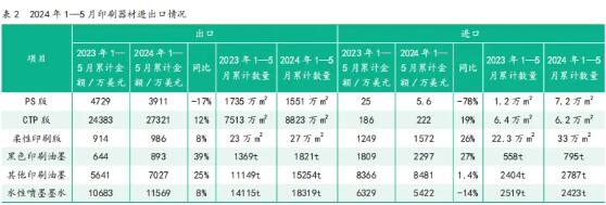 (1)膠印機 1)卷筒紙膠印機 2024年1—5月,出口卷筒紙膠印機35臺,金額674萬美元,金額同比下降13%。主要出口到東南亞和歐洲。其中,出口到越南10臺,金額151萬美元;出口到土耳其6臺,金額115萬美元。 2023年1—5月,出口卷筒紙膠印機45臺,金額776萬美元。其中,從河北出口到西班牙2臺,金額94萬美元。 2024年1—5月,進口卷筒紙膠印機12臺,金額416萬美元,金額同比下降66%。其中,從日本進口9臺,金額358萬美元;從法國進口到廣東2臺,金額42萬美元。 2023年1—5月,進口卷筒紙膠印機40臺,金額1226萬美元。其中,從印度進口到廣東1臺,金額14萬美元;從日本進口31臺,金額900萬美元;從法國進口4臺,金額179萬美元;從德國進口4臺,金額135萬美元。 2)單張紙膠印機(不包含單色膠印機) 2024年1—5月,出口單張紙膠印機334臺,金額5898萬美元,同比下降3.5%。 2023年1—5月,出口單張紙膠印機353臺,金額6109萬美元。 2024年1—5月,進口單張紙膠印機350臺,金額2.3億美元,同比下降18%。進口全部來自德國和日本。其中,進口自德國237臺,1.6億美元,約占總進口金額的69%;進口自日本113臺,7100萬美元。 2023年1—5月,進口單張紙膠印機373臺,金額2.8億美元。進口全部來自德國和日本。其中,進口自德國279臺,2.1億美元,占進口總金額的75%;進口自日本94臺,6874萬美元。 (2)柔性印刷版印刷機 2024年1—5月,進口柔性印刷版印刷機6臺,金額1069萬美元,金額同比增長49%。其中,從加拿大進口到江蘇1臺,金額611萬美元;從德國進口到遼寧1臺,金額263萬美元;從意大利進口到廣東1臺,金額71萬美元。 2023年1—5月,進口柔性印刷版印刷機10臺,金額720萬美元。其中,從德國進口2臺,金額475萬美元。 2024年1—5月,出口柔性印刷版印刷機611臺,金額4406萬美元,金額同比增長13%。其中,從浙江出口到印度50臺,金額246萬美元。 2023年1—5月,出口柔性印刷版印刷機565臺,金額3907萬美元。其中,從廣東出口到印尼9臺,金額241萬美元。 (3)凹版印刷機 2024年1—5月,進口凹版印刷機11臺,金額1433萬美元,金額同比增長208%。其中,從瑞士進口到江蘇1臺,金額806萬美元;從意大利進口到江蘇1臺,金額460萬美元;從日本進口到河北1臺,金額139萬美元。 2023年1—5月,進口凹版印刷機7臺,金額466萬美元。其中,從日本進口到安徽2臺,金額309萬美元;從瑞士進口到廣東2臺,金額155萬美元。 2024年1—5月,出口凹版印刷機629臺,金額3471萬美元,金額同比增長41%。其中,出口印尼43臺,金額655萬美元;出口越南138臺,金額631萬美元。 2023年1—5月,出口凹版印刷機539臺,金額2462萬美元。其中出口越南97臺,金額477萬美元;出口印度22臺,金額293萬美元。 2.印刷器材 2024年1—5月印刷器材進出口數據如表2所示。