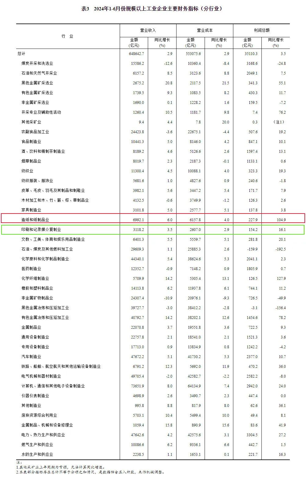 1—6月份,規模以上工業企業實現營業收入64.86萬億元,同比增長2.9%;發生營業成本55.31萬億元,增長2.9%;營業收入利潤率為5.41%,同比提高0.03個百分點。其中,造紙和紙制品業實現營業收入6992.1億元,同比增長6.0%;印刷和記錄媒介復制業實現營業收入3118.2億元,同比增長3.5%。 6月末,規模以上工業企業資產總計172.05萬億元,同比增長5.7%;負債合計99.07萬億元,增長5.4%;所有者權益合計72.97萬億元,增長6.0%;資產負債率為57.6%,同比下降0.1個百分點。 6月末,規模以上工業企業應收賬款24.75萬億元,同比增長8.6%;產成品存貨6.37萬億元,增長4.7%。 1—6月份,規模以上工業企業每百元營業收入中的成本為85.27元,同比增加0.02元;每百元營業收入中的費用為8.43元,同比增加0.05元。 6月末,規模以上工業企業每百元資產實現的營業收入為76.3元,同比減少2.4元;人均營業收入為178.8萬元,同比增加7.5萬元;產成品存貨周轉天數為20.3天,同比增加0.2天;應收賬款平均回收期為66.2天,同比增加3.5天。 6月份,規模以上工業企業實現利潤同比增長3.6%。 國家統計局工業司統計師于衛寧解讀工業企業利潤數據表示,上半年,隨著各項宏觀政策落實落細,工業生產平穩較快增長,企業利潤持續穩定恢復,工業企業效益狀況呈現以下主要特點:工業企業利潤增速有所加快。工業企業營收穩定恢復。裝備制造業有力支撐工業利潤增長。消費品制造業利潤持續快速增長。采礦業、原材料制造業利潤降幅明顯收窄。企業當月單位成本繼續同比減少。總體看,上半年規上工業企業效益平穩恢復,同時也要看到,國內有效需求不足制約企業效益持續改善,國際環境嚴峻復雜加大企業經營壓力,工業企業效益恢復基礎仍需鞏固。