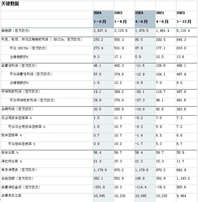 2024年1-6月(2023年1-6月同比數(shù)據(jù)) 銷售額為29.37億歐元(同比:31.16億歐元) 經(jīng)營性利潤為4600萬歐元(同比:4.02億歐元);可比經(jīng)營性利潤為5700萬歐元(3.8億歐元) 稅前利潤為1900萬歐元(同比:3.89億歐元);可比稅前利潤為3000萬歐元(同比:3.7億歐元) 可比已占用資本回報(bào)率為1.8%(同比:10.7%) 經(jīng)營性凈現(xiàn)金流負(fù)2.52億歐元(同比:1800萬歐元) 2024年4-6月(2023年4-6月同比數(shù)據(jù)) 銷售額為14.8億歐元(同比:14.81億歐元) 經(jīng)營性利潤為負(fù)1200萬歐元(同比:1.27億歐元);可比經(jīng)營性利潤為負(fù)1300萬歐元(同比:1.04億歐元) 稅前利潤為負(fù)2600萬歐元(同比:1.19億歐元);可比稅前利潤為負(fù)2700萬歐元(同比:9800萬歐元) 可比已占用資本回報(bào)率為-0.3%(同比:5.9%) 經(jīng)營性凈現(xiàn)金流為負(fù)1.14億歐元(同比:負(fù)1900萬歐元) 2024年上半年主要事件 芬林集團(tuán)長(zhǎng)纖漿在歐洲和中國的平均銷售價(jià)格較上一季度有所增長(zhǎng)。 歐洲和北美市場(chǎng)對(duì)針葉商品漿的需求強(qiáng)勁。在中國,商品漿的采購活動(dòng)有所減弱。 與上一季度相比,芬林集團(tuán)紙板產(chǎn)品的需求和價(jià)格保持穩(wěn)定。交貨量略有增加。 在對(duì)蒸發(fā)部門氣體爆炸造成的損壞進(jìn)行修復(fù)后,凱米生物制品廠于6月份重新投入生產(chǎn)。 4月,芬林紙板做出了升級(jí)辛佩萊(Simpele)工廠紙機(jī)的投資決定。 2024年5月13日,芬林集團(tuán)完成將旗下俄羅斯子公司的所有權(quán)轉(zhuǎn)讓給VLP集團(tuán)的交易。2022年,芬林集團(tuán)停止了在俄羅斯的業(yè)務(wù)運(yùn)營,包括斯維爾(Svir)鋸材廠、木材供應(yīng)和紙板銷售。5月完成交易后,芬林集團(tuán)在俄羅斯不再擁有任何資產(chǎn)。該交易對(duì)財(cái)報(bào)期內(nèi)的經(jīng)營成果產(chǎn)生了1380萬歐元的影響。 2024年7-9月業(yè)績(jī)展望 與2024年4-6月相比,芬林集團(tuán)7-9月的可比經(jīng)營性利潤預(yù)計(jì)將有所改善。 芬林集團(tuán)總裁與首席執(zhí)行官何亦凱(IlkkaHämälä): 2024年上半年,芬林集團(tuán)的財(cái)務(wù)狀況非常不景氣。這是由于銷售價(jià)格(尤其是紙漿和紙板)同比下降,以及木材成本持續(xù)上升。在財(cái)報(bào)期內(nèi),因政治罷工導(dǎo)致營業(yè)利潤損失6000萬歐元。凱米(Kemi)生物制品廠蒸發(fā)部門發(fā)生的氣體爆炸使可比營業(yè)利潤在保險(xiǎn)賠償前減少了約1億歐元。盡管數(shù)據(jù)黯淡,我們的許多業(yè)務(wù)都取得了積極的發(fā)展。在歐洲,紙漿市場(chǎng)在第二季度表現(xiàn)強(qiáng)勁,價(jià)格水平也在不斷提高。2024年對(duì)原生纖維紙板的需求與去年創(chuàng)紀(jì)錄的低水平相比明顯有所改善。盡管建筑行業(yè)持續(xù)疲軟,但Kerto®LVL(單板層積材)在價(jià)格和需求方面都保持了穩(wěn)定和良好的水平。生活用紙的盈利狀況仍在合理范圍,但原材料價(jià)格對(duì)業(yè)績(jī)水平有很大影響。在我們所有的產(chǎn)品類別中,目前只有鋸材和云杉膠合板的疲軟周期仍在繼續(xù),它們直接受到了建筑業(yè)低迷情緒的影響。 年初,我們繼續(xù)為集團(tuán)的未來發(fā)展做工作。我們的Kuura®紡織纖維項(xiàng)目已進(jìn)入下一階段,我們將在該階段探索工業(yè)投資的機(jī)會(huì)。示范工廠將繼續(xù)運(yùn)營,為市場(chǎng)生產(chǎn)紡織品原料,以獲得客戶反饋。 位于芬蘭勞馬(Rauma)的模塑MuotoTM纖維基包裝工業(yè)規(guī)模工廠的前期工程項(xiàng)目正在進(jìn)展中。今年下半年,我們?cè)诎瑑?nèi)科斯基(Äänekoski)的示范工廠將從開發(fā)活動(dòng)轉(zhuǎn)向?yàn)樽罱K客戶生產(chǎn),為工廠的工業(yè)化階段尋求產(chǎn)品開發(fā)反饋。該產(chǎn)品的主要最終用途是替代化石材料用于食品包裝。我們還在研究于艾內(nèi)科斯基建造的示范工廠提煉木質(zhì)素的問題。木質(zhì)素可用于替代許多化學(xué)工業(yè)產(chǎn)品中的化石原料。它的第一個(gè)應(yīng)用領(lǐng)域?qū)⑹腔炷列袠I(yè)中使用的添加劑。從紙漿行業(yè)的燃燒氣體中捕捉碳的研究是一個(gè)非常廣泛和重要的開發(fā)項(xiàng)目。歐盟未來更嚴(yán)格的碳捕集目標(biāo)包括大量技術(shù)碳捕集計(jì)劃。芬林集團(tuán)的碳捕集潛力每年超過1000萬噸,但該項(xiàng)目在技術(shù)方面極具挑戰(zhàn)性,并且需要立法支持捕集碳的使用。 這些大型開發(fā)項(xiàng)目的準(zhǔn)備和潛在實(shí)施需要芬林集團(tuán)的現(xiàn)有業(yè)務(wù)保持競(jìng)爭(zhēng)力,并為開發(fā)投入創(chuàng)造現(xiàn)金流。芬林集團(tuán)主要產(chǎn)品的市場(chǎng)正在不斷擴(kuò)大,我們?cè)谶x定的產(chǎn)品細(xì)分市場(chǎng)中擁有強(qiáng)大的地位。紙漿行業(yè)對(duì)芬蘭林業(yè)極為重要,其形勢(shì)與我們作為全球最大的針葉商品漿生產(chǎn)商的市場(chǎng)地位相匹配。 芬林芬寶的所有四家工廠在針葉漿生產(chǎn)方面都具有世界一流的績(jī)效表現(xiàn),其中凱米和艾內(nèi)科斯基工廠與競(jìng)爭(zhēng)對(duì)手相比更是獨(dú)樹一幟。在歐洲和美國,芬林紙板的折疊紙板產(chǎn)品在高要求細(xì)分市場(chǎng)中處于領(lǐng)先地位。去年完成的胡蘇姆(Husum)紙機(jī)產(chǎn)能升級(jí)擴(kuò)建工程使其成為歐洲效率最高的設(shè