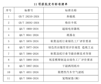 2024年,造紙標(biāo)委會(huì)繼續(xù)堅(jiān)持以行業(yè)需求為導(dǎo)向,不斷深化和完善造紙工業(yè)標(biāo)準(zhǔn)體系,引領(lǐng)造紙行業(yè)綠色、高質(zhì)量發(fā)展。截止目前,共有11項(xiàng)國(guó)家和行業(yè)標(biāo)準(zhǔn)獲批發(fā)布,19項(xiàng)國(guó)家和行業(yè)標(biāo)準(zhǔn)制修訂計(jì)劃批準(zhǔn)下達(dá)。
